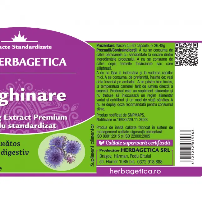 Extract de Anghinare (Cynara scolymus), standardizat cu minimum 2,5% Acid clorogenic și 2,5% Cinarina 500mg