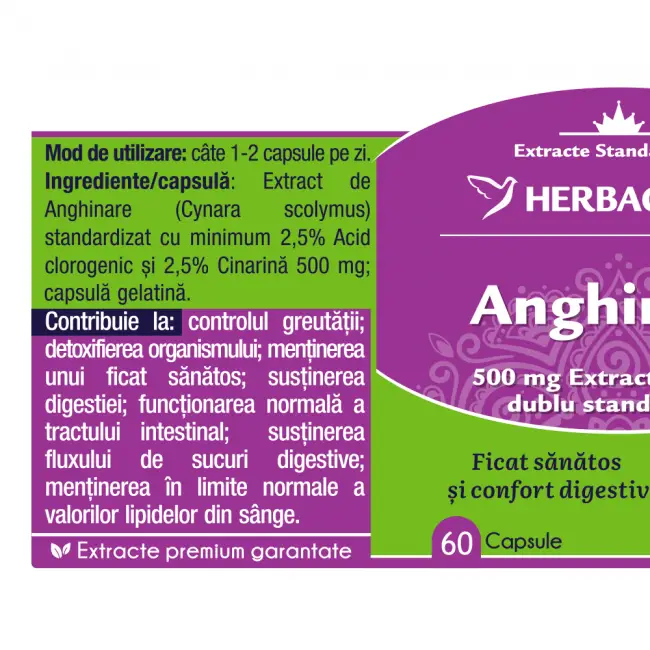 Anghinare este un produs eficient pentru digestie și ficat având o cantitate de 500 mg Anghinare/capsulă cu dublă standardizare: 2,5% Acid Clorogenic și 2,5% Cinarina.