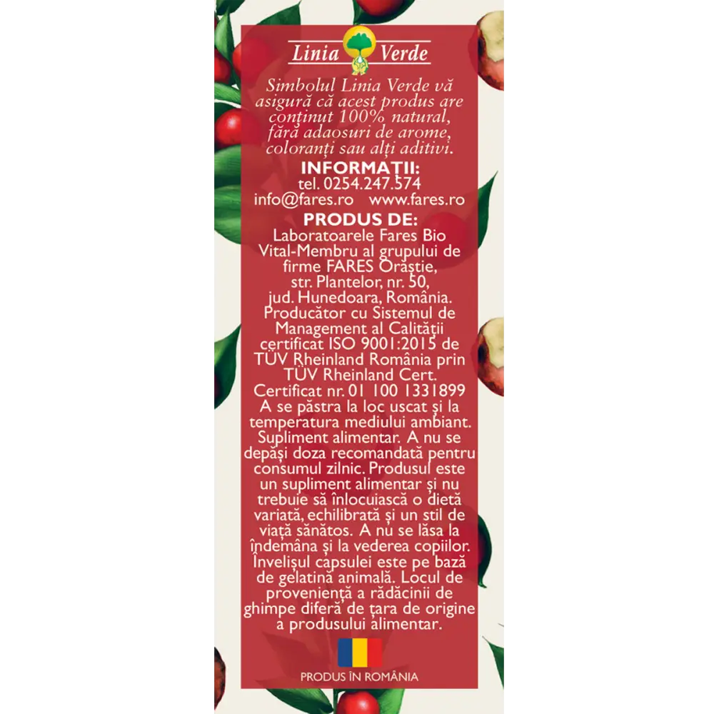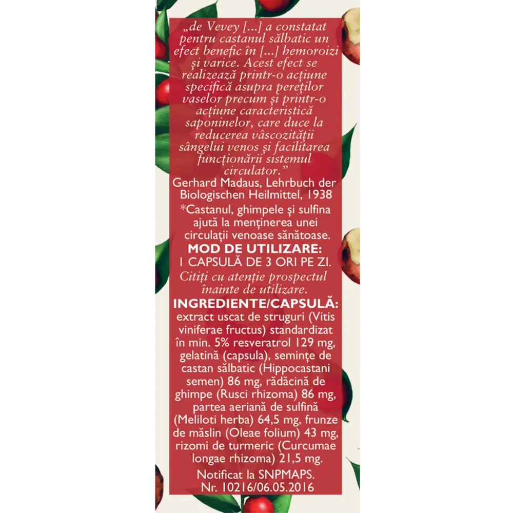 – Extract uscat de struguri (Vitis vinifera) standardizat în min. 5% resveratrol 129 mg