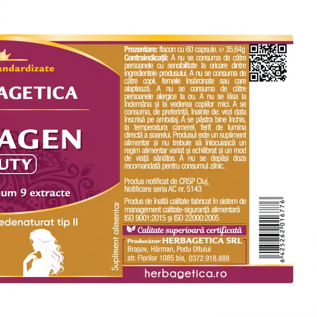 Collagen Beauty este un supliment inovator, creat pentru a reda pielii tale strălucirea, fermitatea și aspectul tânăr pe care le merită. Formula sa unică conține două tipuri de colagen și 6 extracte vegetale cu efect anti-ageing, oferind o soluție completă pentru combaterea semnelor vizibile de îmbătrânire. Administrarea este simplă și comodă, produsul fiind disponibil sub formă de capsule, ceea ce îl face ușor de integrat în rutina zilnică de îngrijire.