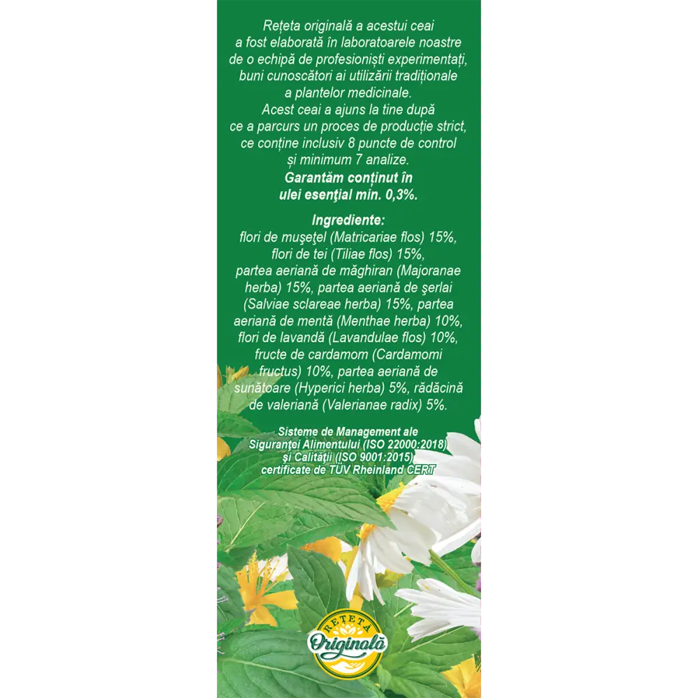 Flori de muşeţel (Matricariae flos) 15%, flori de tei (Tiliae flos), măghiran (Majoranae herba), şerlai (Salviae sclareae herba), mentă (Menthae herba) 10%, flori de lavandă (Lavandulae flos), fructe de cardamom (Cardamomi fructus), sunătoare (Hyperici herba) 5%, rădăcină de valeriană (Valerianae radix).