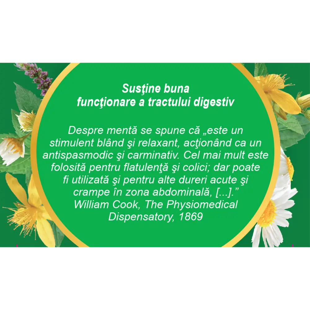 • calmant, stimulează secreția sucurilor gastrointestinale, antispastic, ajută la eliminarea gazelor.