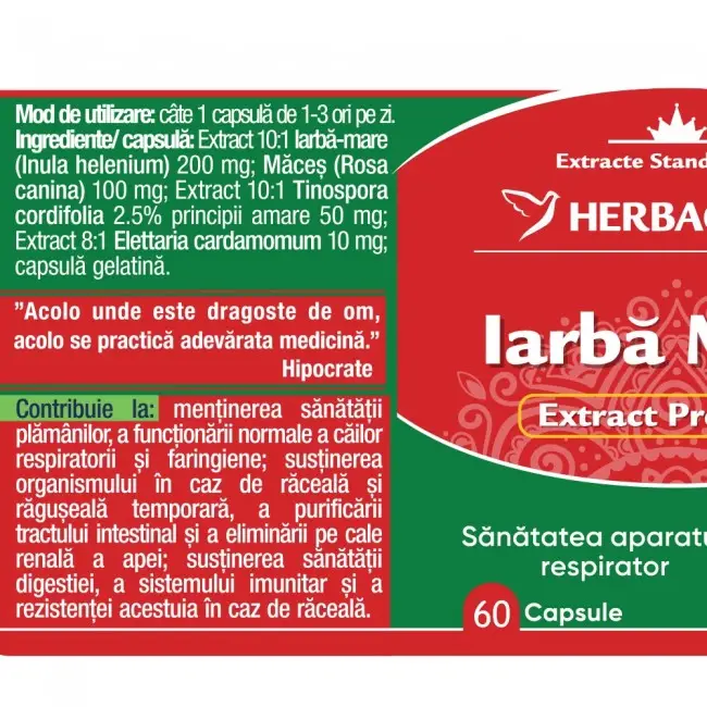 Iarbă Mare este un supliment alimentar natural cu efect decongestionant pentru căile respiratorii, cu o formulă concentrată de 200 mg Iarbă-Mare/capsulă, îmbogățită cu extracte de Giloy, Cardamon și Măceș.