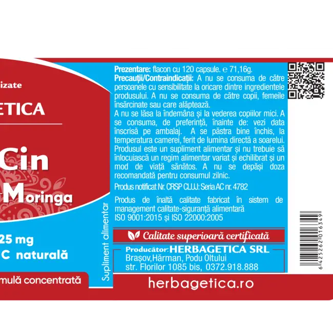ImunoCin conține 4000 UI Vitamina D3, 25 mg Zinc și Vitamina C naturală nativă, formulă îmbogățită cu extract de Moringa.