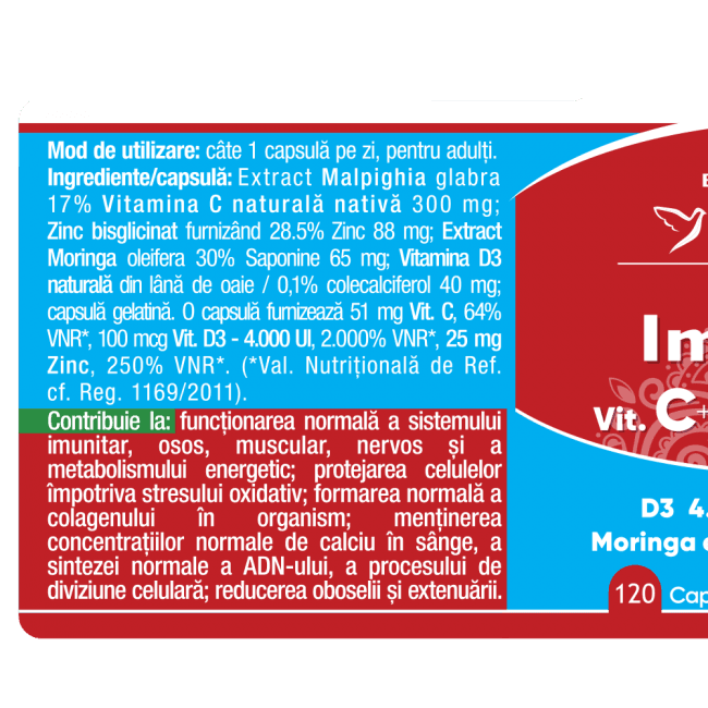 ImunoCin conține 4000 UI Vitamina D3, 25 mg Zinc și Vitamina C naturală nativă, formulă îmbogățită cu extract de Moringa.