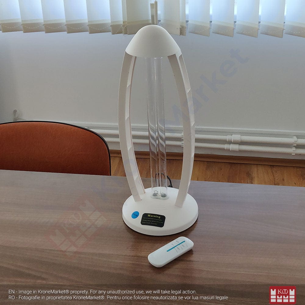 Lampa Sterilizatoare Mobilă UVC bactericidă KMK-1 38W, cu ozon pentru uz casnic sau de birouri, chioșcuri, camere hoteluri și pensiuni, birouri notariale și avocațiale, diferite incinte cu diferite destinații ca: baruri, cafenele, restaurante, toalete publice și altele. Strerilizarea aerului și a suprafețelor din încăperi de viruși și bacterii (inclusiv mucegai)