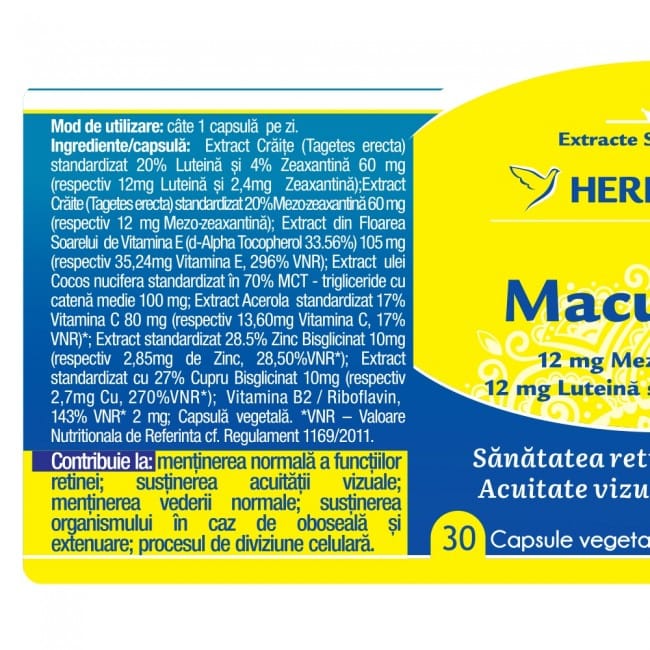 MacuRetin conție toti cei 3 pigmenți maculari: Luteină, Zeaxantină Și Mezo-Zeaxantină, obținuți din extractul natural de flori de Crăiță. Fiecare capsulă de MacuRetin asigură: