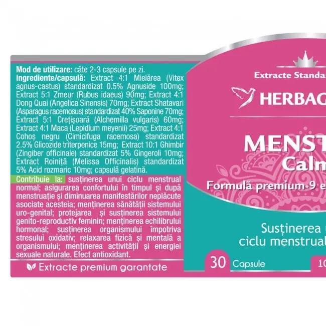 Menstrocalm, prin formula concentrată cu 9 extracte naturale intense, redă confortul și starea de bine în zilele delicate ale lunii. Menstrocalm reglează ciclul menstrual prin extractele de Vitex, Maca, Dong Quai, Crețișoară, Cohoș Negru, Shatavari. Extractele din compoziție îmbunătățesc relația dintre glanda pituitară și creierși reduc excesul de prolactină.