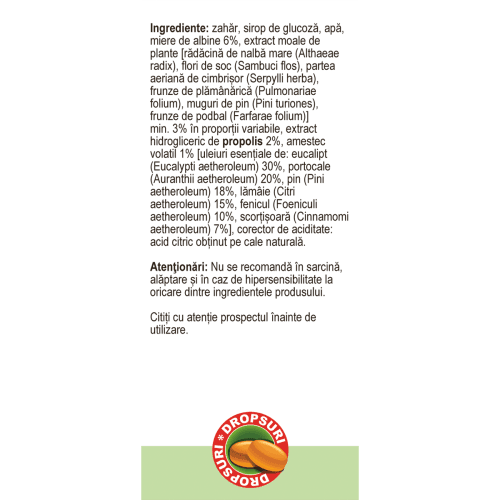 zahăr, sirop de glucoză, apă, miere de albine 6%, extract moale de plante [rădăcină de nalbă mare (Althaeae radix), flori de soc (Sambuci flos), partea aeriană de cimbrișor (Serpylli herba), frunze de plămânărică (Pulmonariae folium), muguri de pin (Pini turiones), frunze de podbal (Farfarae folium)] min. 3% în proporții variabile, extract hidrogliceric de propolis 2%, amestec volatil 1% [uleiuri esențiale de: eucalipt (Eucalypti aetheroleum) 30%, portocale (Auranthii aetheroleum) 20%, pin (Pini aetheroleum) 18%, lămâie (Citri aetheroleum) 15%, fenicul (Foeniculi aetheroleum) 10%, scorțișoară (Cinnamomi aetheroleum) 7%], corector de aciditate: acid citric obținut pe cale naturală.Mod Administrare