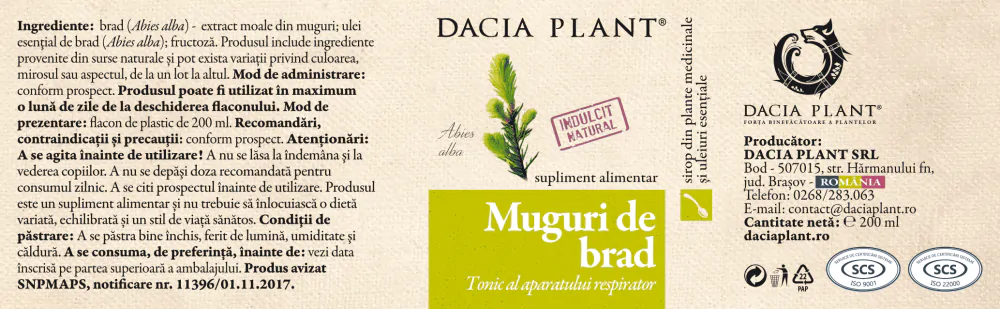 echinacea (Echinacea purpurea) – extract hidrogliceric (68,67%); propolis – extract hidrogliceric cu minimum 12 mg/ml polifenoli (30%); amestec de uleiuri esentiale [menta-salbatica (Mentha arvensis)(28,58%); eucalipt (Eucalyptus globulus)(28,58%); bergamota (Citrus aurantium ssp. bergamia)(14,28%); lamaie (Citrus limonum) (14,28%); fenicul (Foeniculum vulgare)(14,28%)](1,33%).