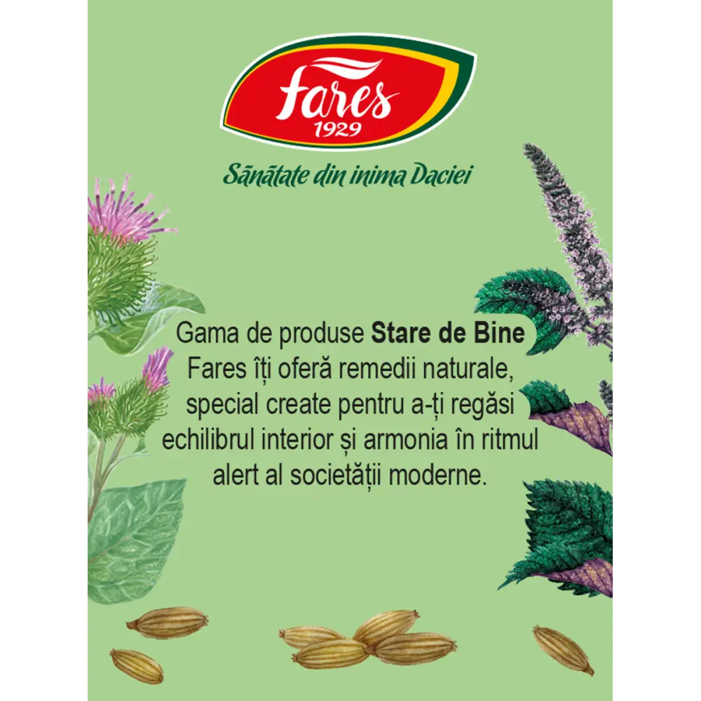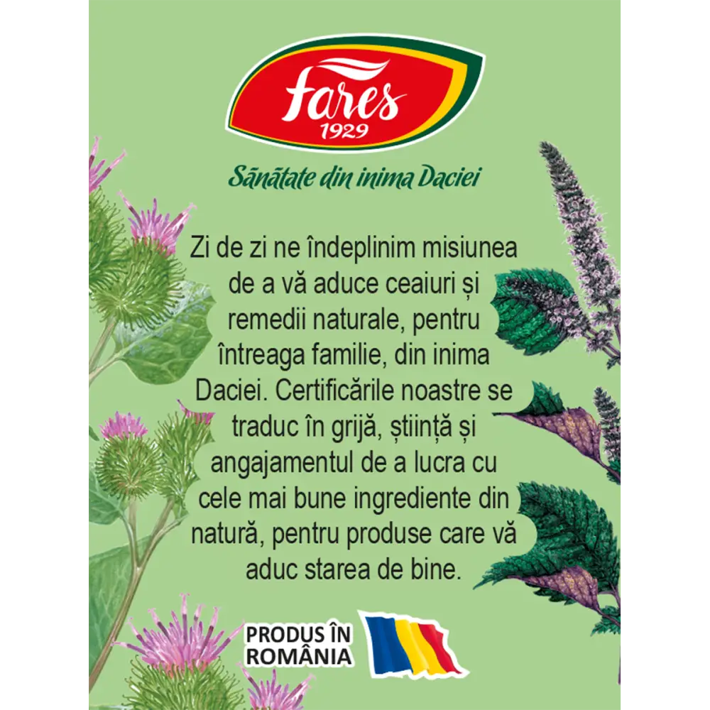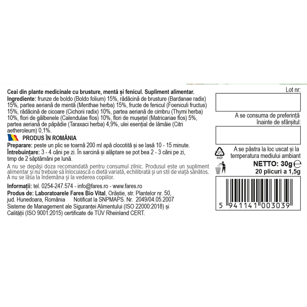 Frunze de boldo (Boldo folium) 15%, rădăcină de brusture (Bardanae radix) 15%, partea aeriană de mentă (Menthae herba) 15%, fructe de fenicul (Foeniculi fructus) 15%, rădăcină de cicoare (Cichorii radix) 10%, partea aeriană de cimbru (Thymi herba) 10%, flori de gălbenele (Calendulae flos) 10%, flori de muşeţel (Matricariae flos) 5%, partea aeriană de păpădie (Taraxaci herba) 4,9%, ulei esenţial de lămâie (Citri aetheroleum) 0,1%.