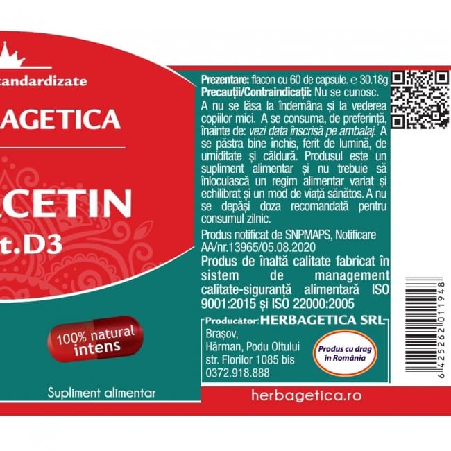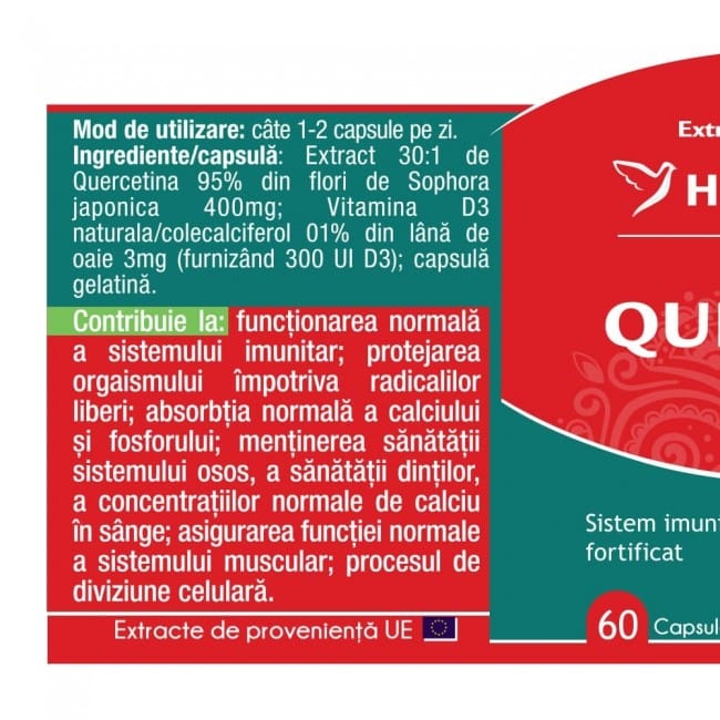 Quercetin cu Vitamina D3 este un produs 100% natural cu efect intens antioxidant, care asigură beneficii importante pentru sistemul imunitar și controlul anumitor tipuri de alergii. În compoziția produsului există 2 extracte importante: extractul de flori de Sophora japonica, standardizat cu 95% Quercetina – 400 mg/capsulă și 300 UI Vitamina D3 (colecalciferol) din lanolină, sursă naturală superioară.