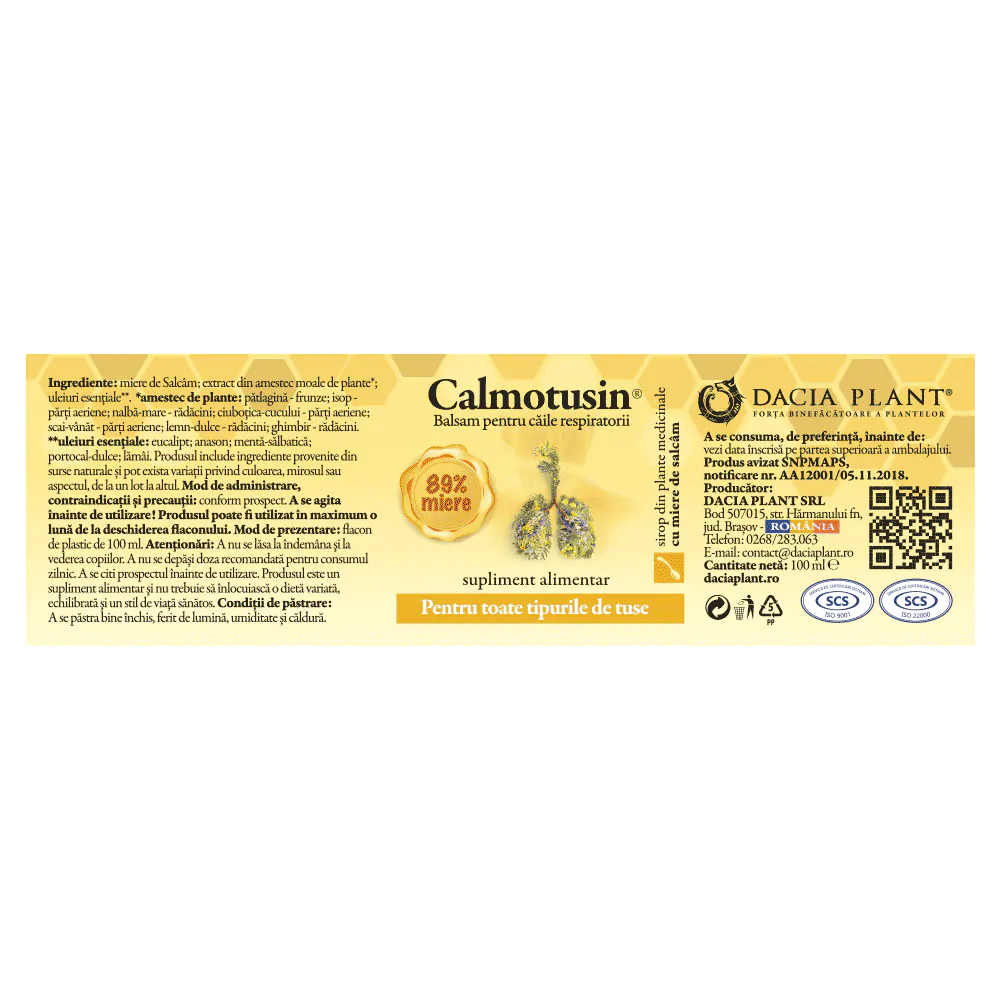 Calmotusin cu miere sirop este un produs natural realizat pe baza de extracte de plante, uleiuri esentiale si miere de salcam ce ajuta la mentinerea sanatatii aparatului respirator. Siropul este un bun emolient, fiind un balsam pentru caile respiratorii.