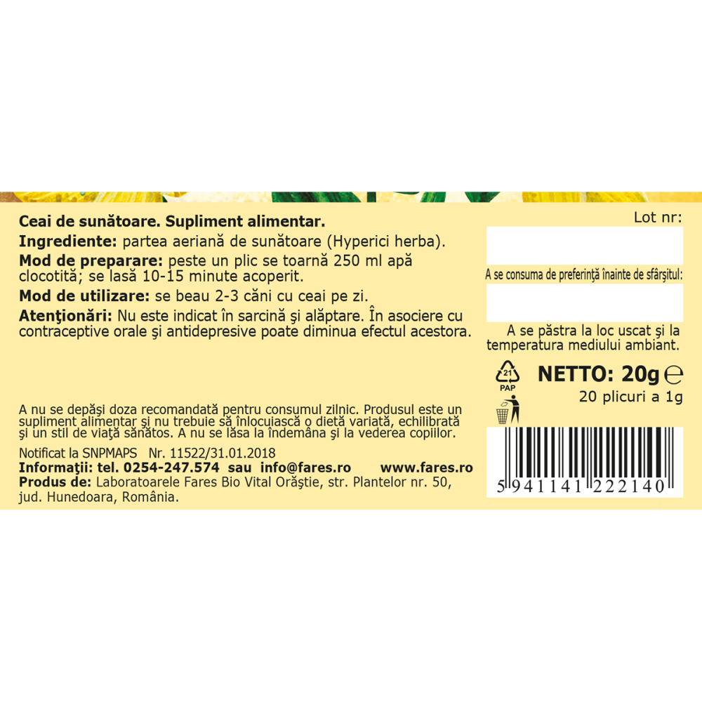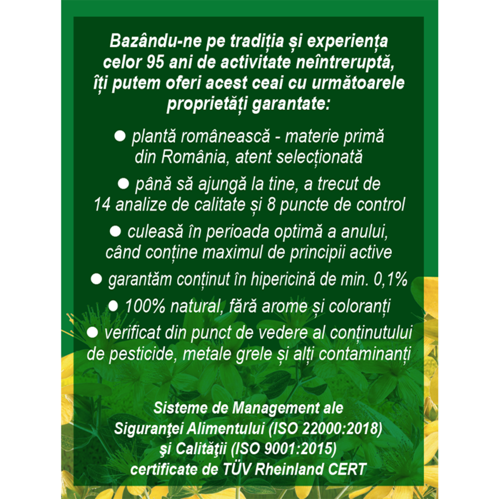 Partea aeriană a plantei Hypericum perforatum L., fam. Hypericaceae, conţine hipericină, flavonozide, epicatecol, proantocianidoli, acizi fenol-carboxilici, carotenoide, vitamina C, hiperforină şi adhiperforină, xantone, colină, rezine, substanţe minerale.
