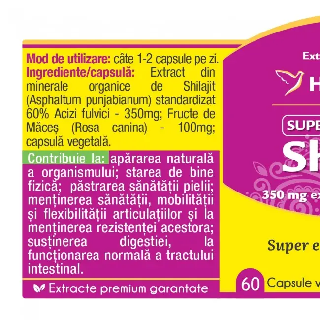 Super Shilajit Mumio are o compoziție concentrată garantând 210 mg de Acizi fulvici/capsulă. Standardizarea ridicată cu 60% acizi fulvici crește considerabil efectul benefic al extractului de Shilajit. Shilajitul conține un întreg complex cu acizi fulvici, aminoacizi, minerale, vitaminele B și polifenoli. Astfel, el se recomandă ca avâd efect imunomodulator, energizant, remineralizant, revitalizant, antiinflamator, antioxidant, adaptogen, neuroprotector și neuroregenerator.