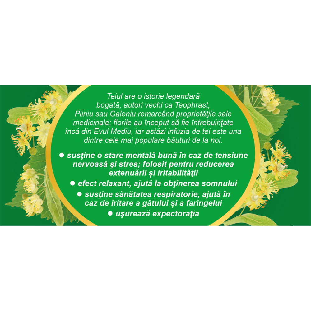 Florile de tei Tilia tomentosa Moench, Tilia cordata Miller, Tilia platyphyllos Scop. conţin: mucilagii, flavonoide, acizi fenolici, hidroxicumarine, ulei esenţial (farnesol).